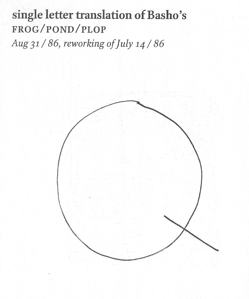 He translated Basho’s haiku with one letter! (Thinking about the title, the use of the word “plop” to translate “the sound of water” was used by RH Blyth in his translation, which in the 1950s and 1960s were well known. See AHOPC #18.) Discovering this in turn led me back to a book of variations by bpNichol (Coach House Books, 2013) and another interpretation of Basho’s haiku (which also appeared in AHOPC #13) by Nichol: