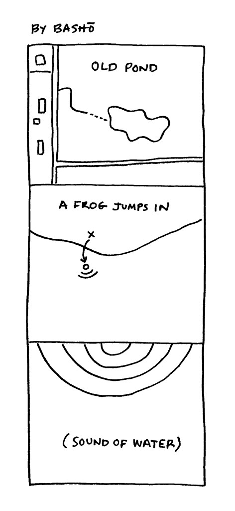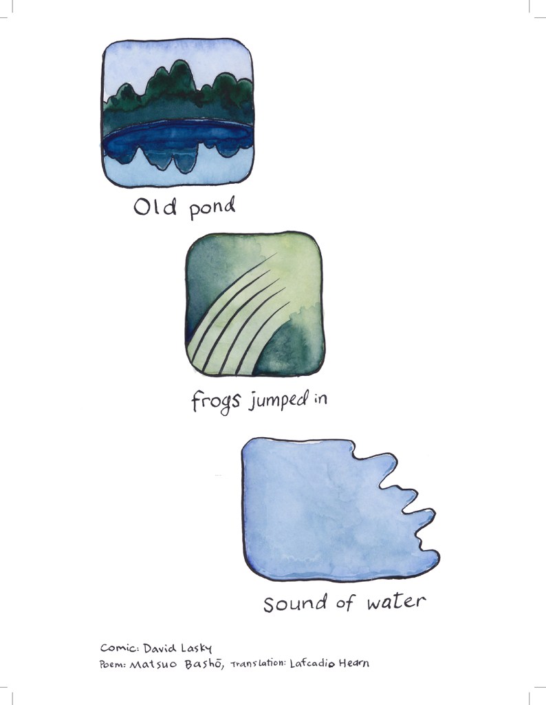 Submitted by David Lasky, Seattle (2020)Submitted by Jari Thymian with this note: “The idea to do a comic for Basho’s frog haiku made me think about all the people who have read or heard the haiku and how it lands in their minds and stays there. It is the frog heard round the world. ”