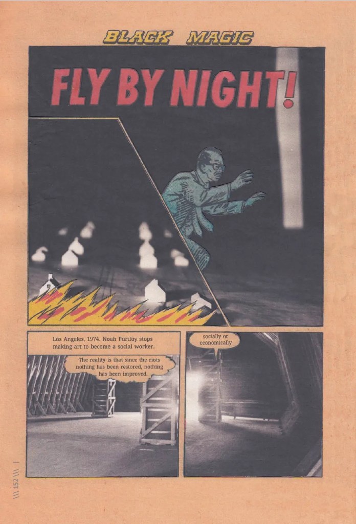 There’s no mistaking he’s currently working within the context of comics. His supplies consist of vintage comic books from the late 1940s and 1950s from which is “excepts” panels and images. As he states in an interview included in the back of Failure Biographies (The Operating System, 2021), “I make comics out of other comics.” (p.170)