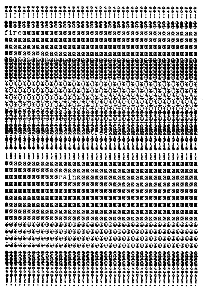 There’s also an urge I sense by the concrete poets to provide context for their ideas. Concrete implies building and foundation. The resulting whole (words as image) underpins the attempt to place letters and typewriter characters graphically on the page often times within frames (or at the least within the restraint of margins). It’s the same process that the comics artist wrestles with – composition on the page within the boundaries of a frame.
