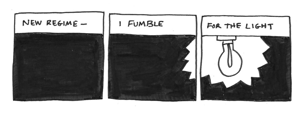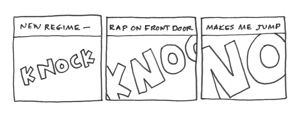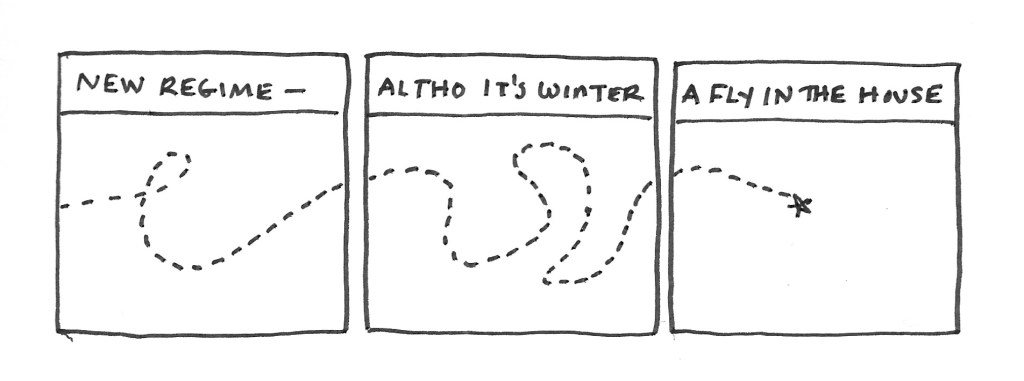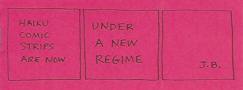 (Haiku Comic Strips Are Now) Under New Regime (2025) – Fourth collection of haiku comic strips. (Future Unwritten Press, 5.5″x2.5″ 12 pp.)